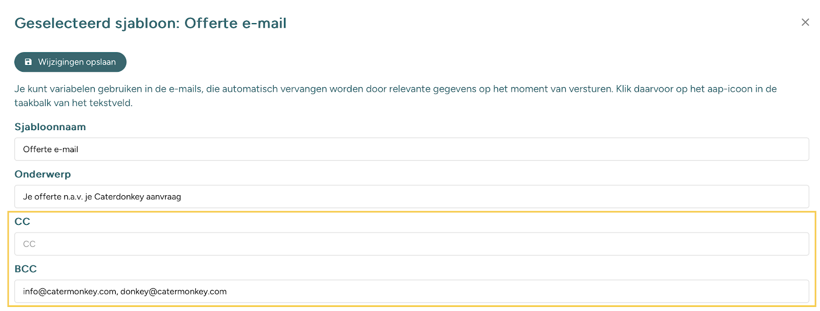 Wil je een kopie van de mails die je uit Catermonkey verstuurt ontvangen? Dan kun je nu een e-mailadres in de CC of BCC van de e-mailsjablonen toevoegen. Dit kunnen meerdere e-mailadressen zijn, gescheiden door een komma ",".