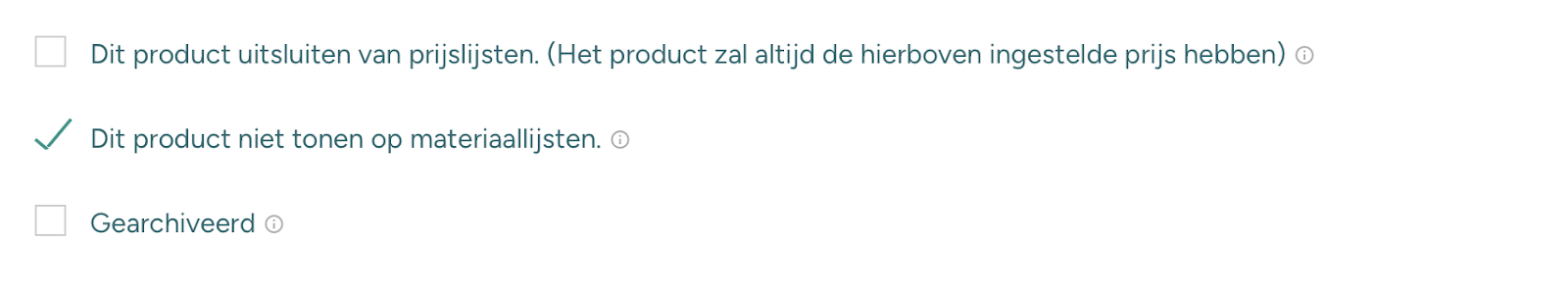 Non-food, zoals personeels- en transportkosten, wil je liever niet op de materiaallijst. Tijdens het bewerken van een product kun je nu onderaan bij Meestal overbodige functies het vinkje "Dit product niet tonen op materiaallijsten" gebruiken.