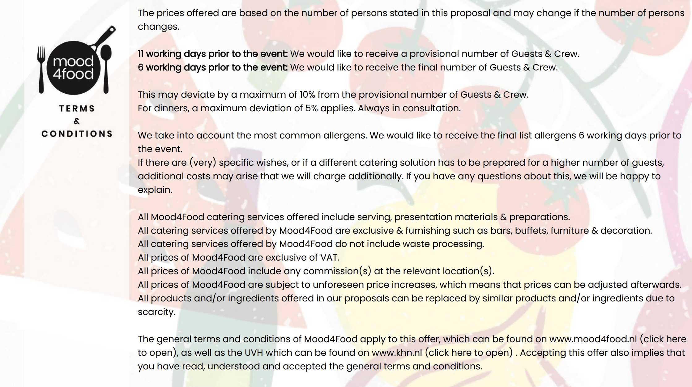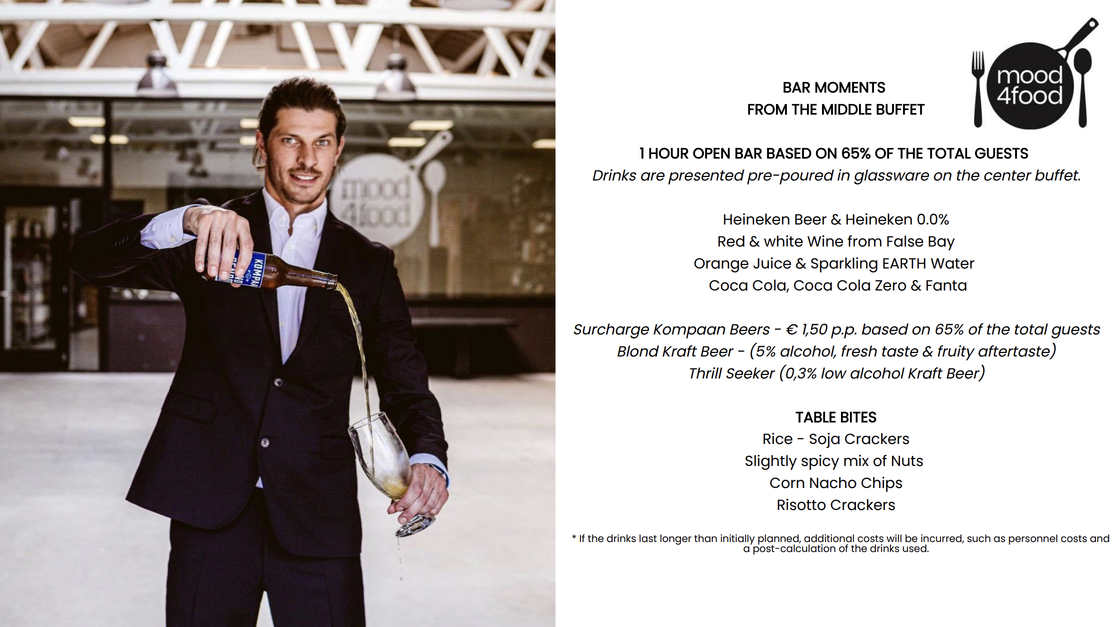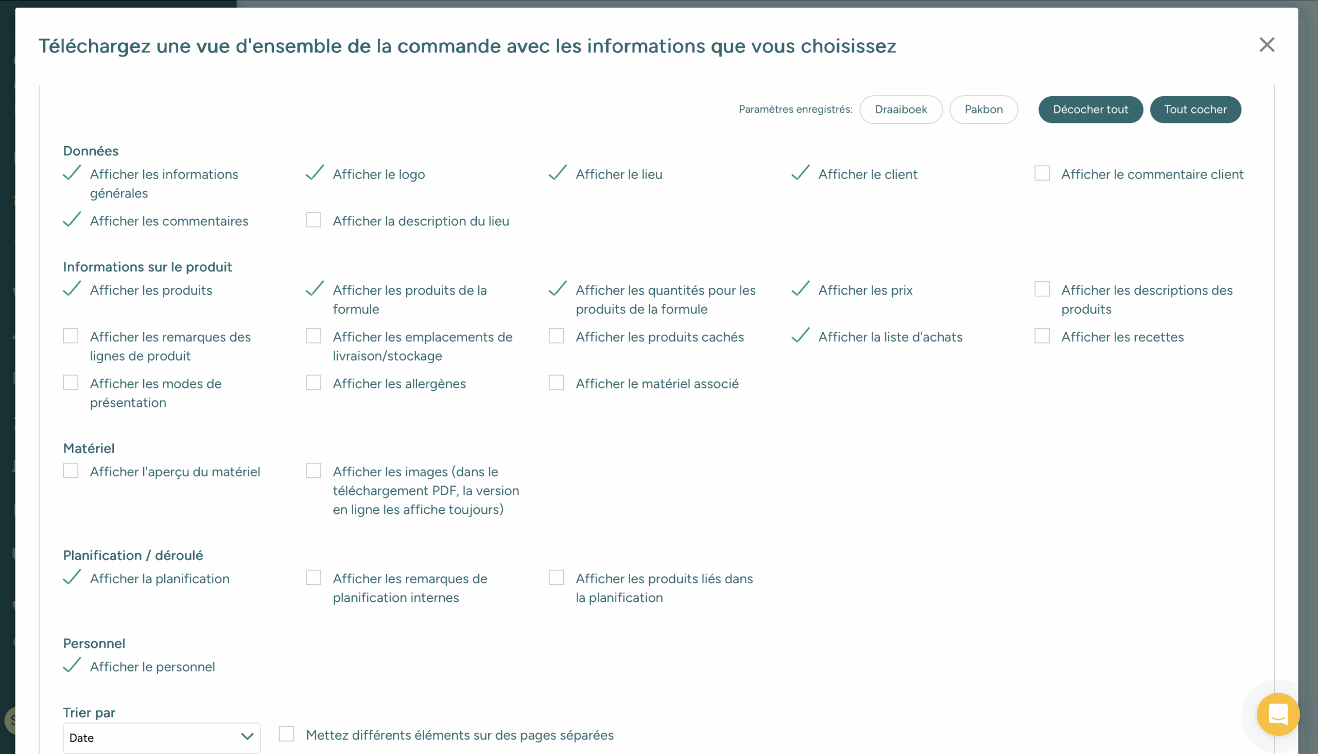 Les données client et l’offre sont automatiquement renseignées en fonction des produits et services sélectionnés. Le résultat? Une mini-brochure professionnelle, entièrement adaptée à l’événement, au buffet, au déjeuner ou au dîner du client.