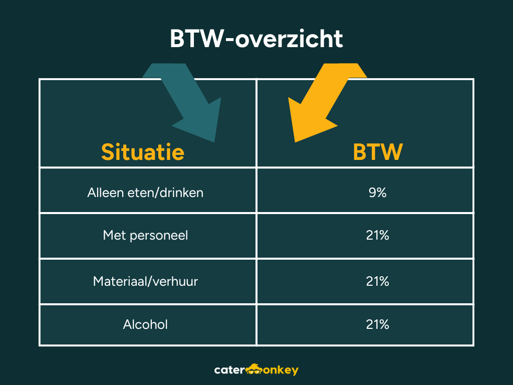 *Let op: het 9%-tarief geldt alleen als je uitsluitend eten en alcoholvrije dranken levert. Combineer je dit met diensten (zoals bediening), dan kan (een deel van) de prestatie onder 21% vallen.