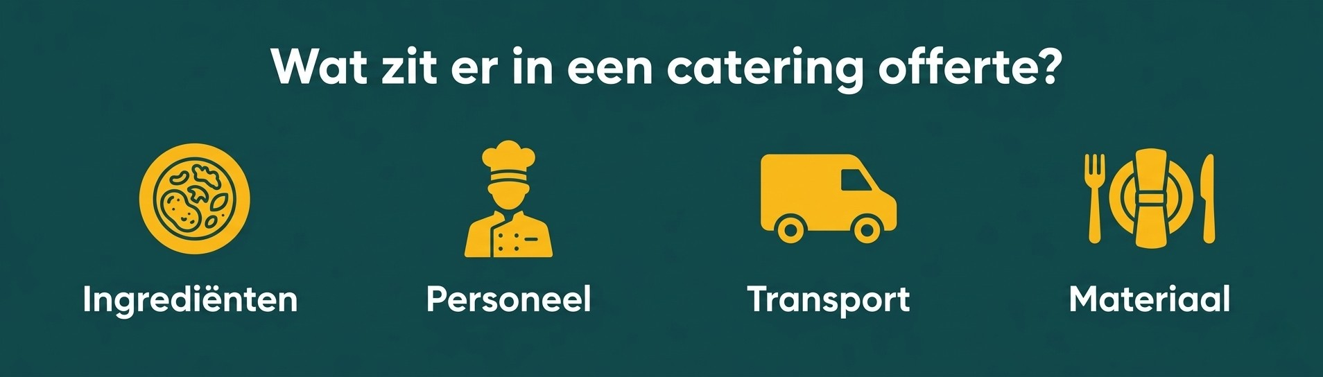 Elke professionele catering offerte begint met vier fundamentele kostenposten die je altijd moet meenemen. Deze basiskosten vormen de basis van je prijsstelling en bepalen of je opdracht winstgevend wordt. In de praktijk zien we dat veel cateraars kosten onderschatten, vooral als het gaat om voorbereiding, transport en personeelsinzet. Dit heeft direct invloed op de uiteindelijke marge van een opdracht.